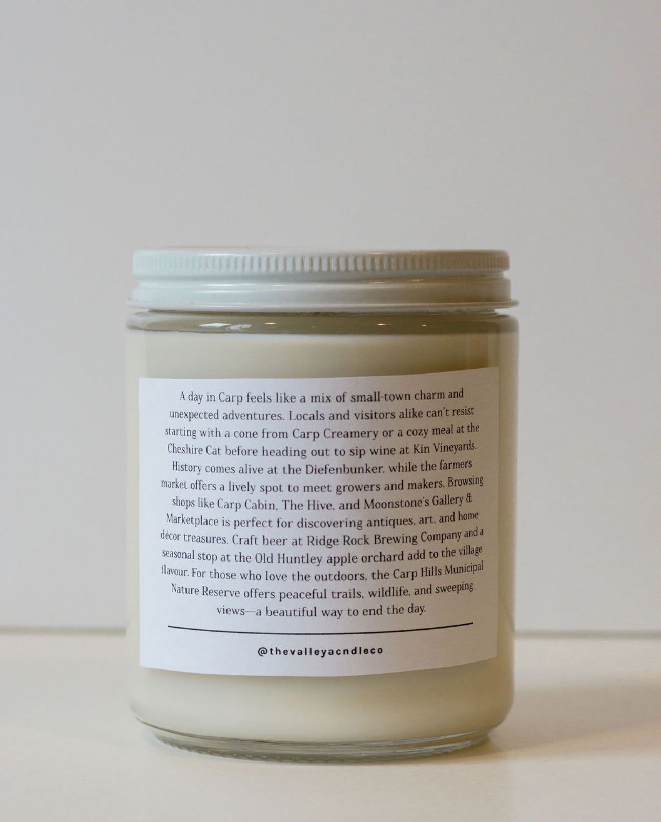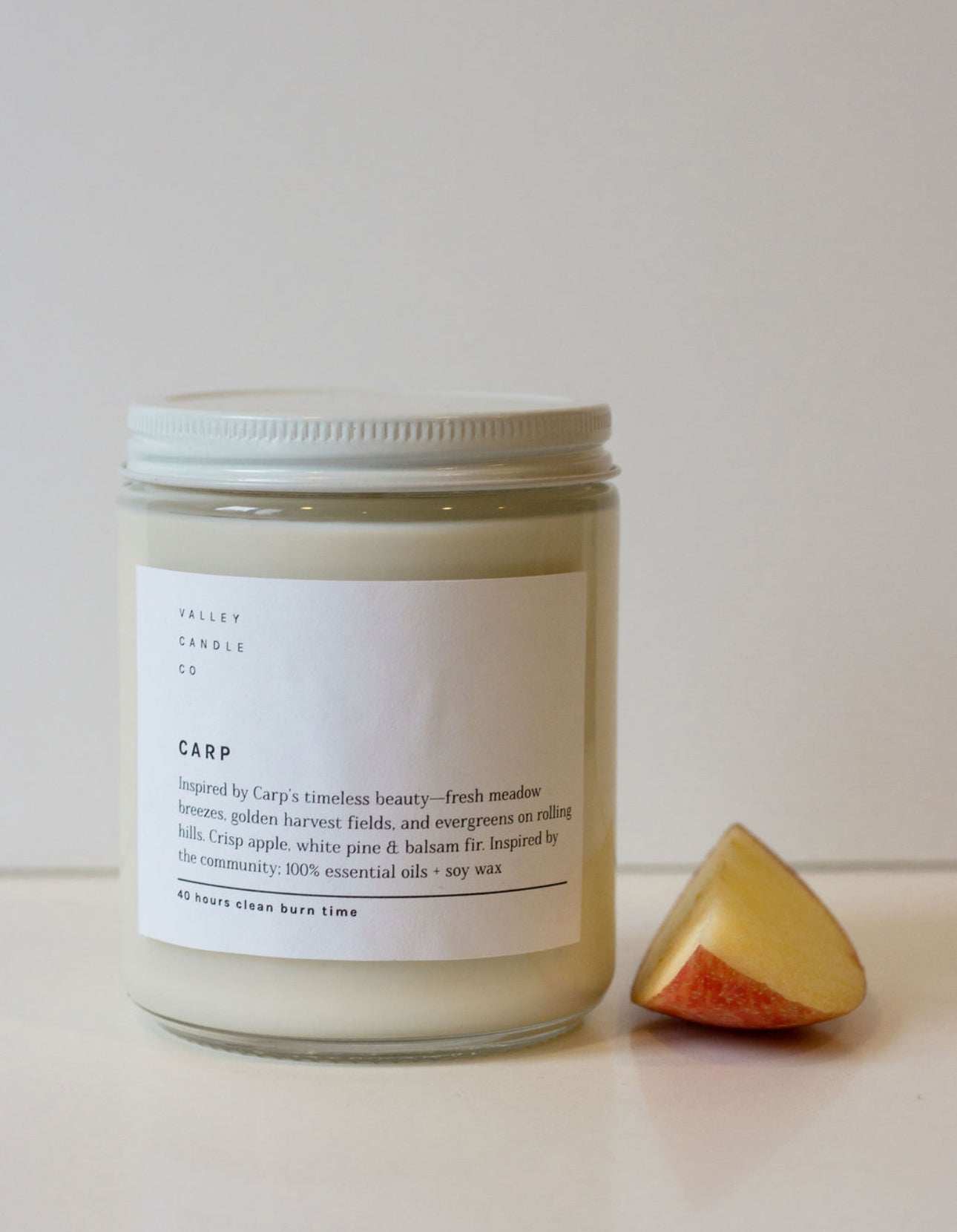 Inspired by Carp’s timeless beauty—fresh meadow breezes, golden harvest fields, and evergreens on rolling hills. Crisp apple, white pine & balsam fir. Inspired by the community; 100% essential oils + soy wax.